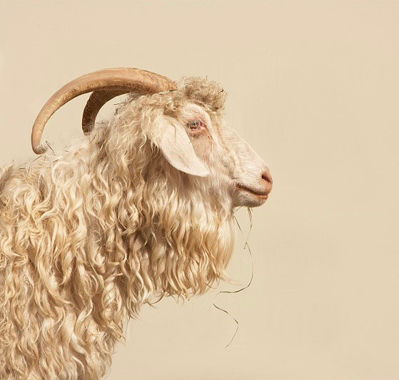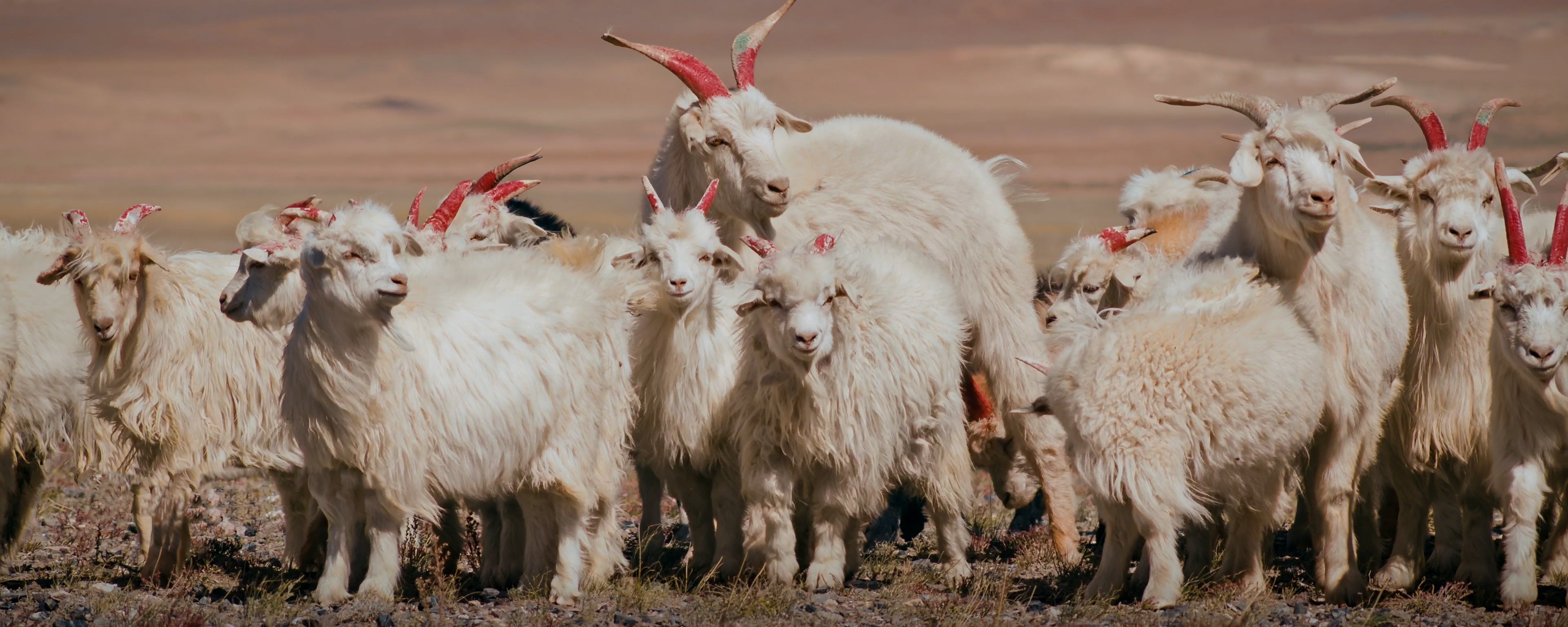 The Animal: The only source of true cashmere is the Kashmir goat (Capra hircus laniger), native to the Himalayas. Its fine undercoat hair is collected by either combing or shearing during the spring moulting season. After sorting and scouring, the fibres are cleaned of coarse outer hairs. Annual yield of underdown averages around 150 g per animal.