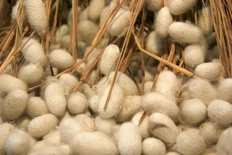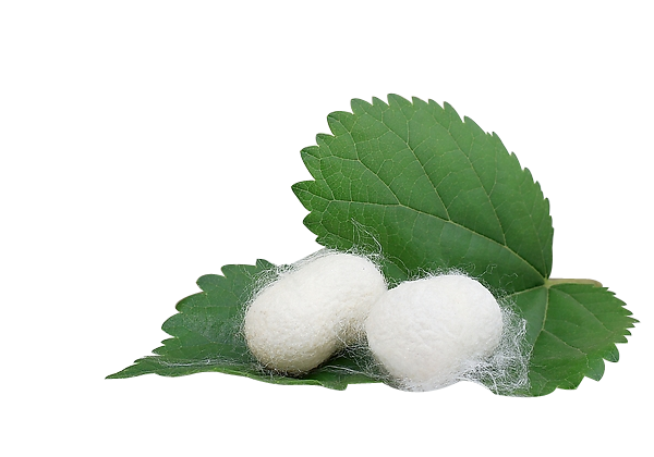 The Animal: Silk is produced by the silkworm, Bombyx mori. Fed on mulberry leaves, it produces liquid silk that hardens into filaments to form its cocoon. The larva is then killed, and heat is used to soften the hardened filaments so they can be unwound. Single filaments are combined with a slight twist into one strand, a process known as filature or "silk reeling".